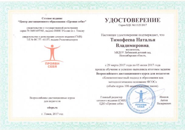 С 29 марта 2017 года по 05 июня 2017 года прошла обучение и успешно выполнила итоговое задание Всероссийского дистанционного курса для педагогов "Компетентностный подход в образовании как методологическое основание ФГОС" (объем курса 108 академических часов)