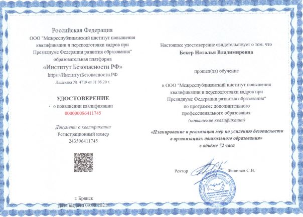 Прошла обучение "Планирование и реализация мер по усилению безопасности в организациях дошкольного образования" в объеме 72 часа